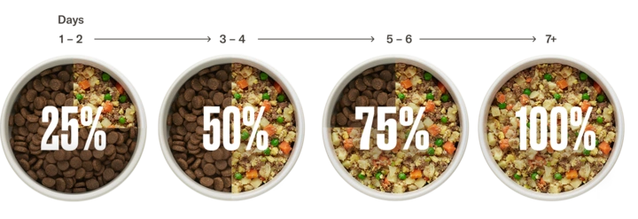 Gradually increase the ratio of Nom Nom’s food while reducing your dog’s current food over the course of a week. This will allow their stomach to gradually adjust to the new diet.